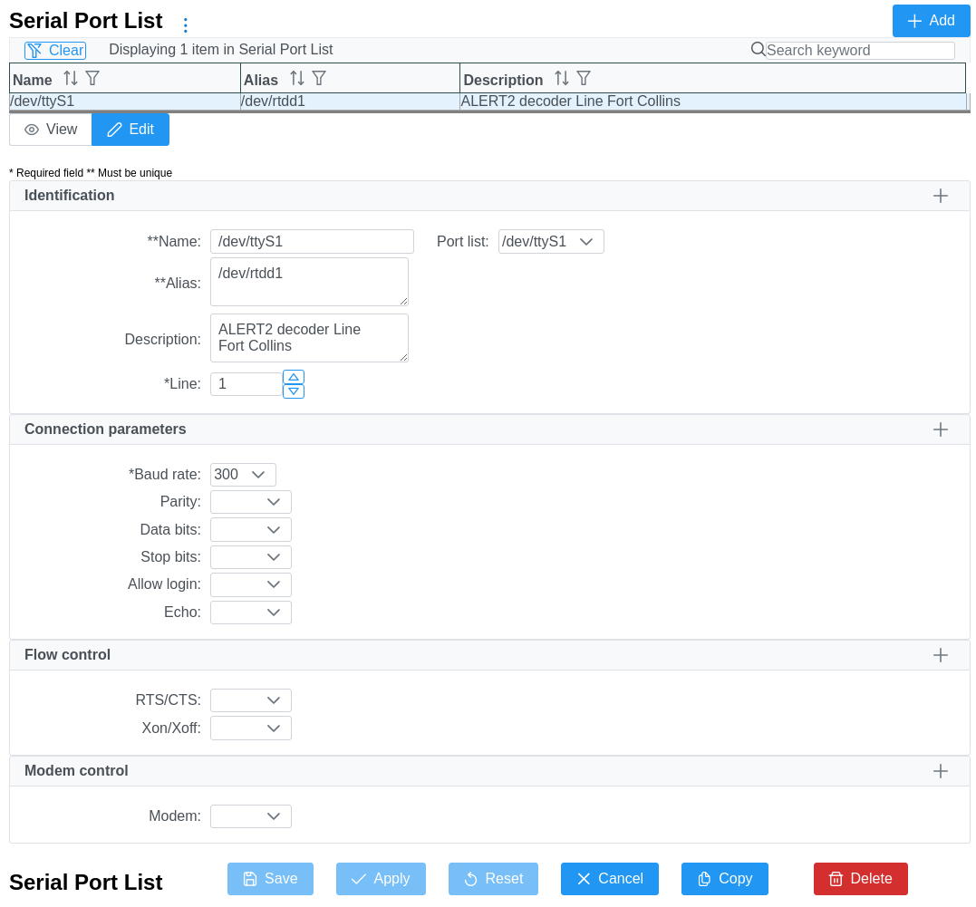 The Serial Ports List page conforms to a layout similar to many data types which includes a list of data items. See List Functionality and Application Functionality for more information detailing page navigation; adding, copying and deleting serial ports; and modifying existing serial ports.